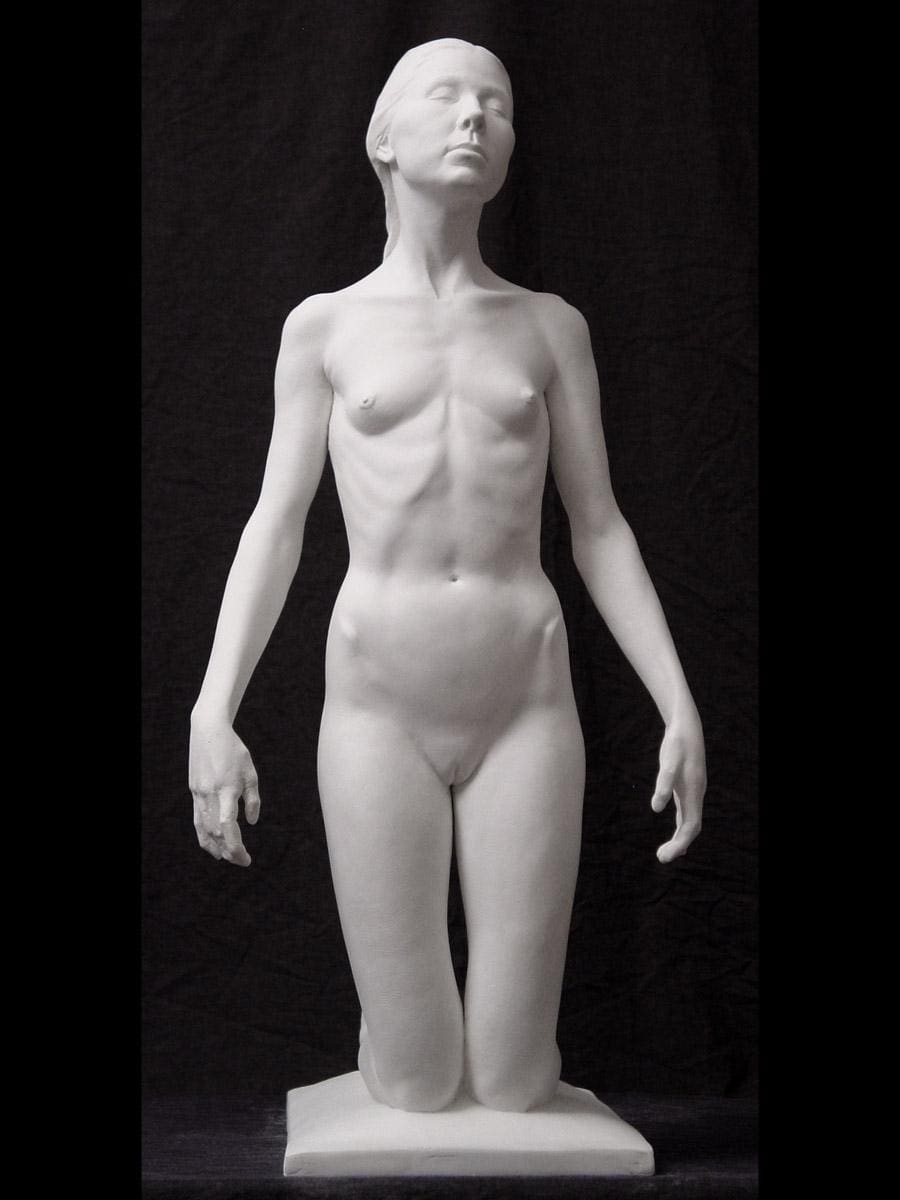 a small woman on her knees with her eyes closed